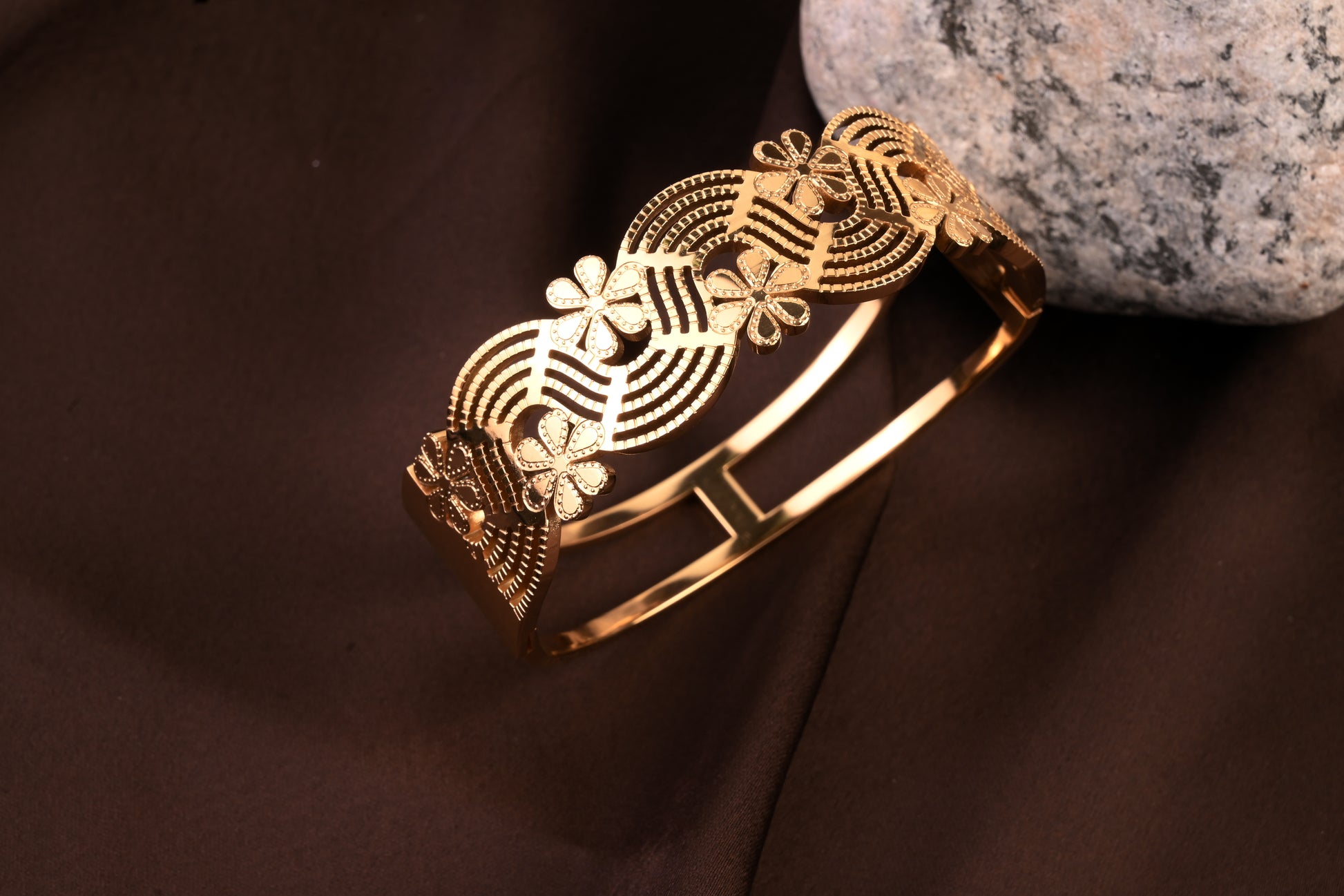 The Golden Wavy Flower Bracelet is a masterpiece of artistry and elegance, designed to add timeless grace to your collection. Featuring intricate floral motifs set against a delicately patterned gold framework, this bracelet radiates sophistication and charm.