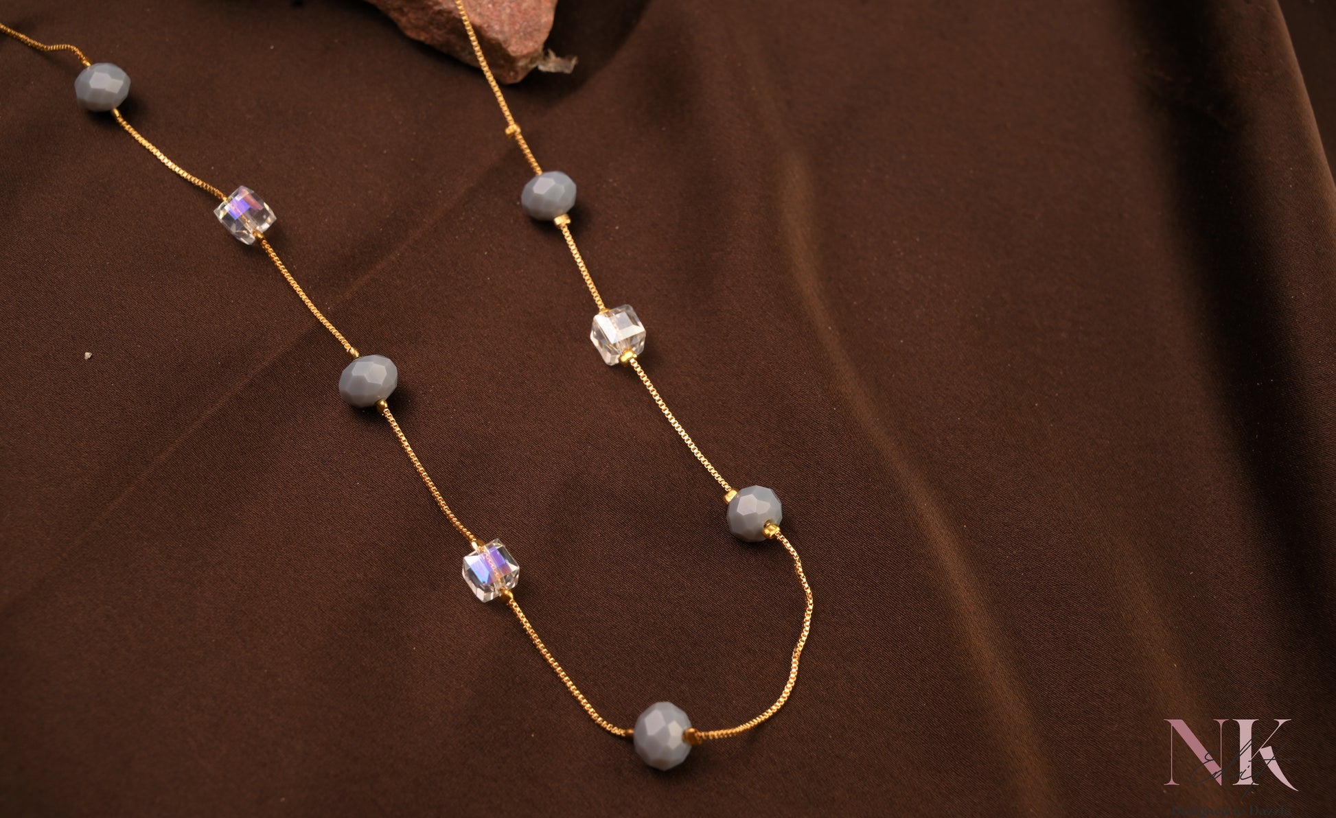 This graceful necklace blends soft elegance with contemporary style, featuring faceted grey crystal beads paired with sparkling cube-cut stones. Each bead is delicately strung on a sleek golden chain, creating a timeless design that radiates sophistication.