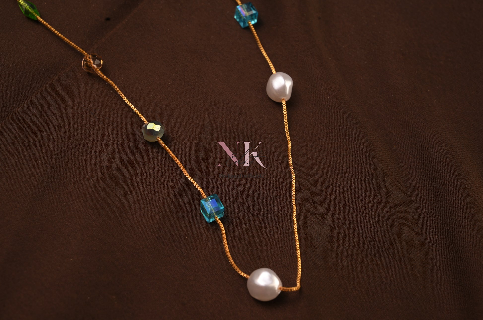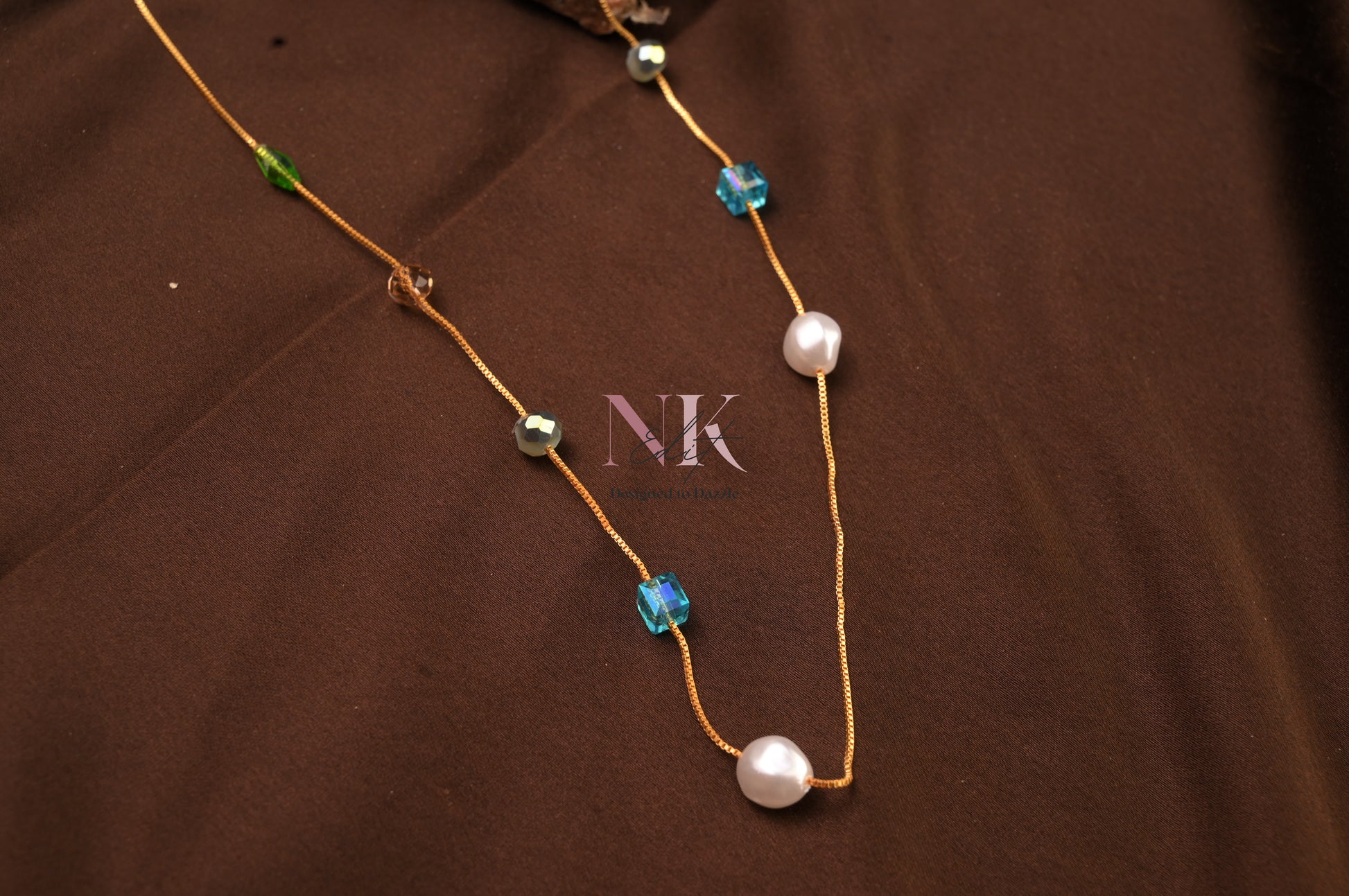 Graceful and timeless, this Pearl Aura Dual-Tone Necklace combines the sophistication of luminous pearls with the sparkle of aqua and crystal-cut beads. Designed on a sleek golden chain, this necklace effortlessly blends classic charm with a refreshing modern appeal. Each bead is carefully placed to create balance and radiance, making it perfect for both everyday elegance and festive glamour.