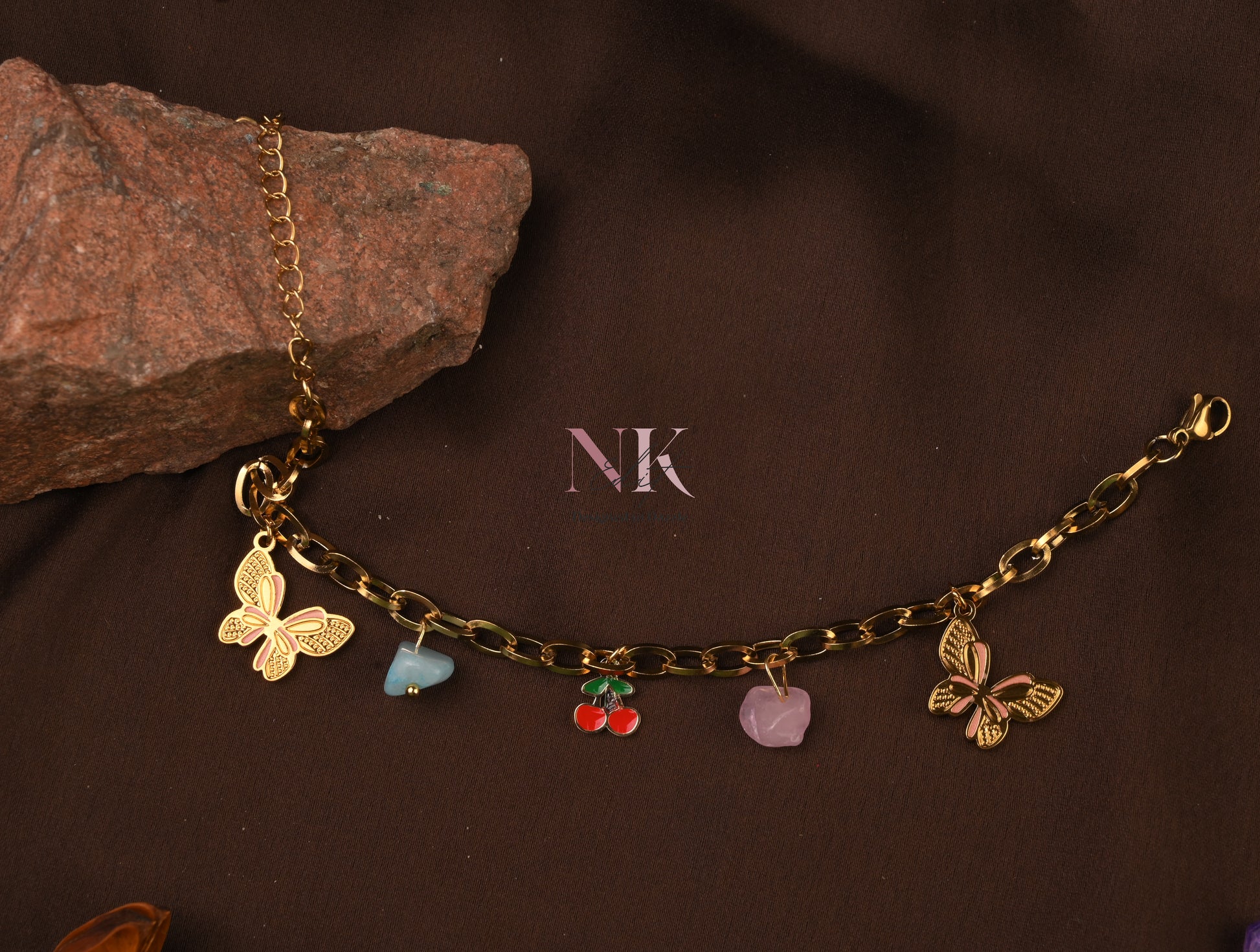 Trendy charm bracelet with butterflies, hearts & cherries — adds playful elegance to any look. Lightweight, anti-tarnish & perfect for daily glam.
