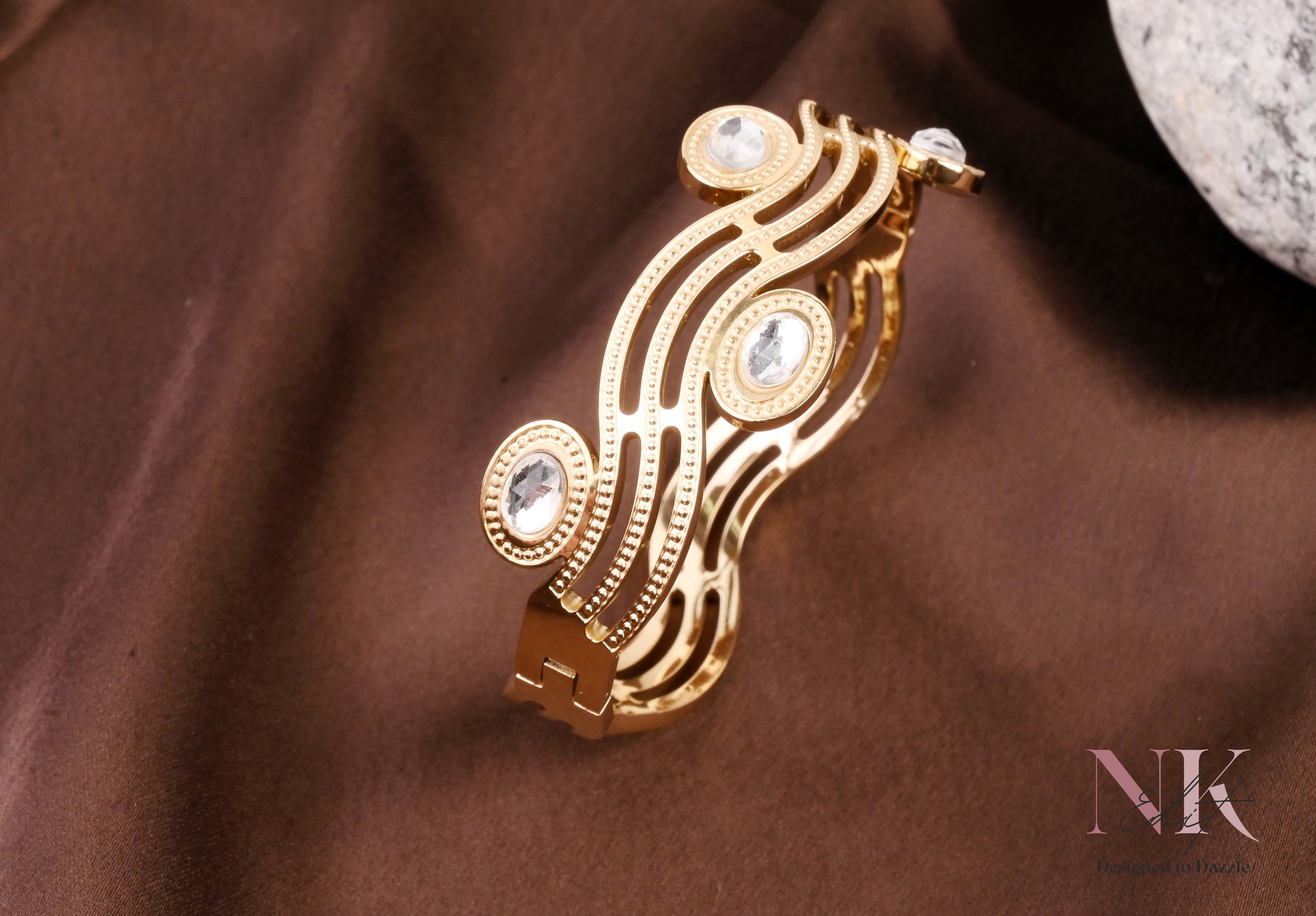The Crystal Waves Luxe Bracelet is a masterpiece of elegance, inspired by the flowing rhythm of waves. Its gold-toned base is adorned with delicately carved wavy lines, enhanced by oval and teardrop-shaped crystals that sparkle with every movement.