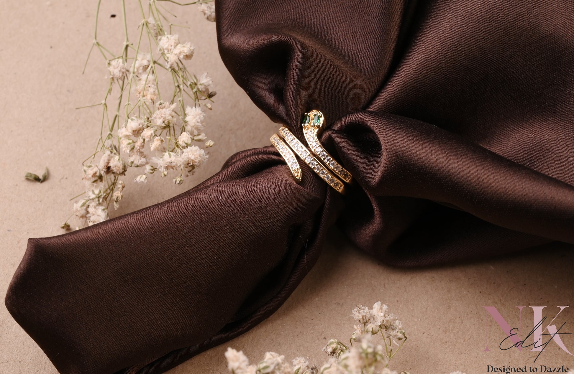 Make a bold and graceful statement with the Emerald Serpent Glam Ring. Designed in a unique wrap-around style, this ring features a sleek serpent-inspired silhouette studded with dazzling crystals along its golden body. The design is crowned with a striking emerald-green stone detail that adds a touch of mystique and sophistication.