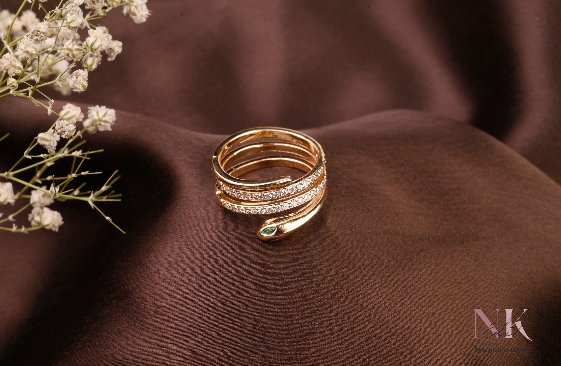 The Emerald Serpent Wrap Ring is a bold expression of elegance and strength. Designed with a multi-layered golden band, it gracefully coils around the finger.