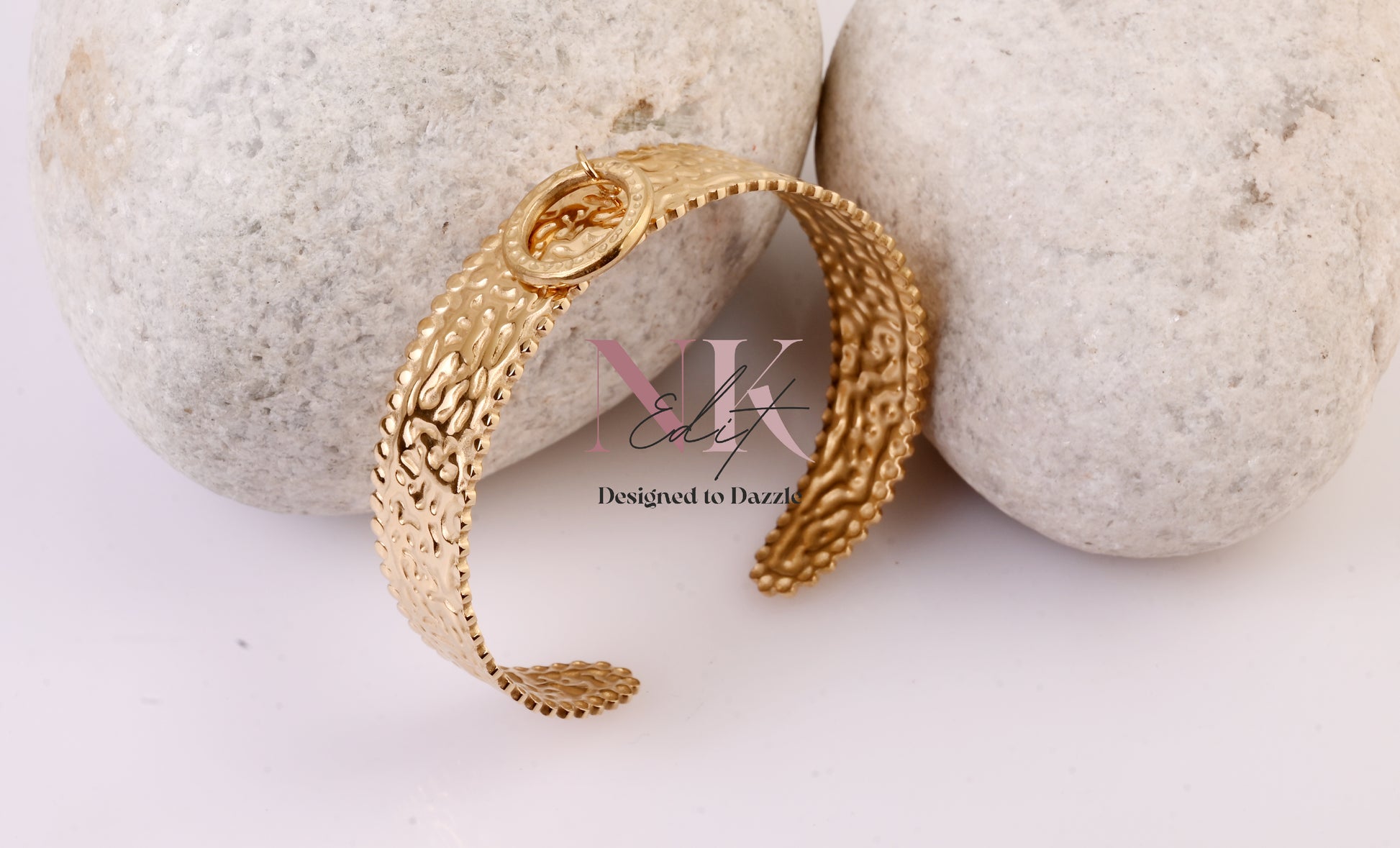 The Golden Textured Elegance Open Cuff is a perfect embodiment of bold grace and refined artistry. Crafted in a radiant gold finish, this bracelet showcases a hammered-texture design that adds depth and character, while a circular charm detail at the center enhances its statement appeal.
