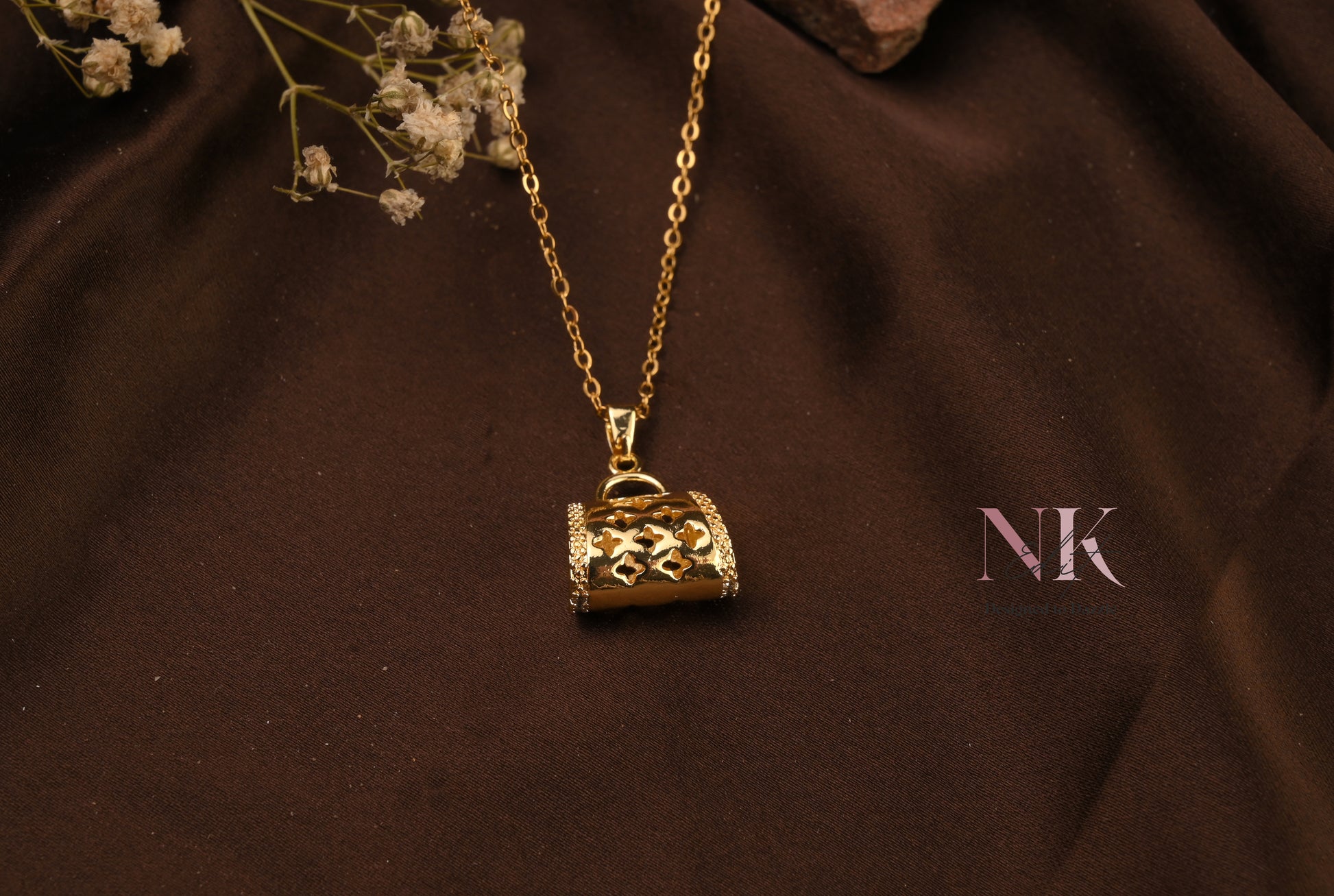 The Regal Charm Gold Pendant Necklace brings together luxury and tradition in a single masterpiece. Crafted with a high-polish gold finish, the pendant features elegant cut-out detailing framed by intricate golden borders. Suspended from a sleek chain, its design radiates timeless charm.